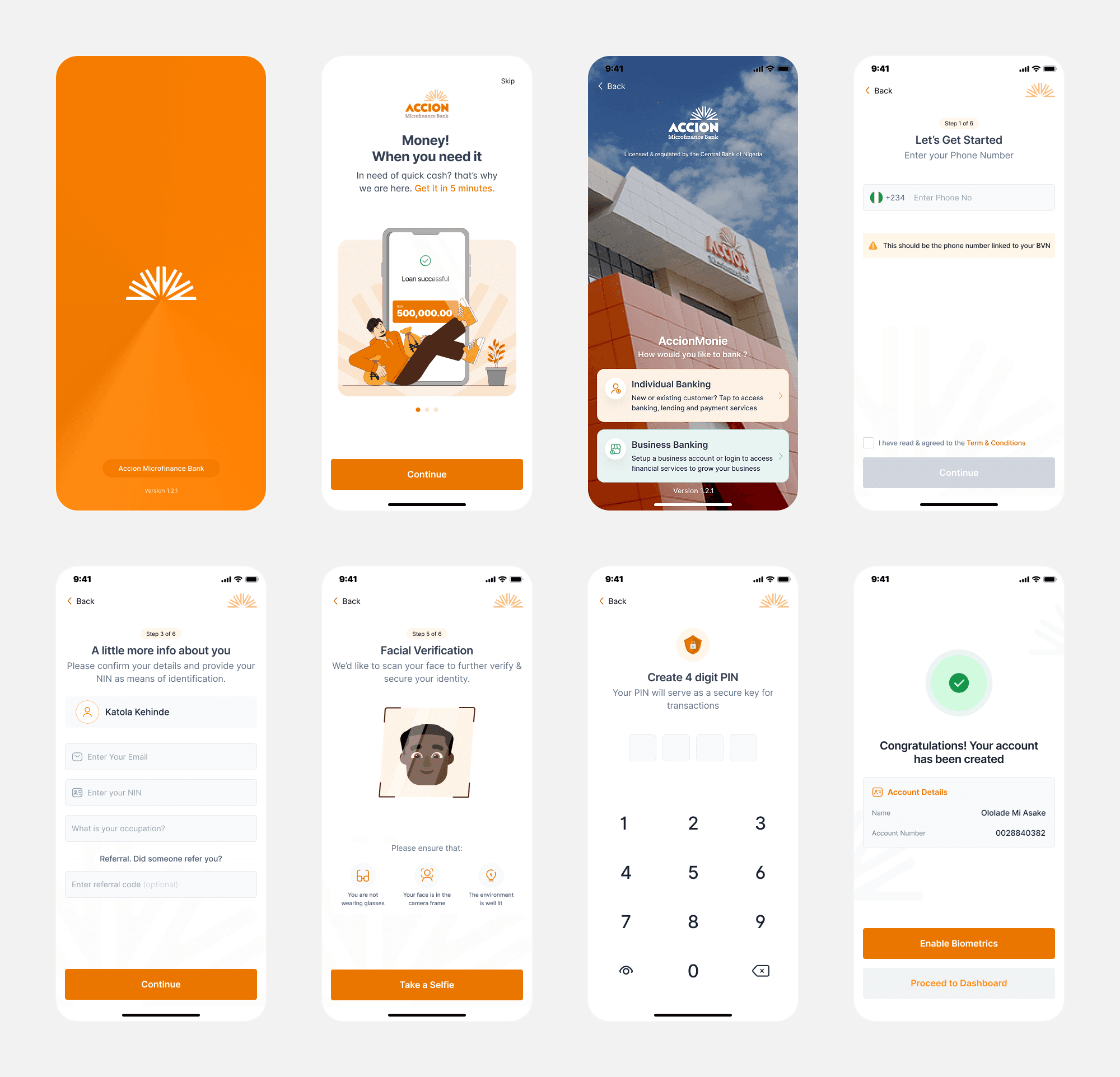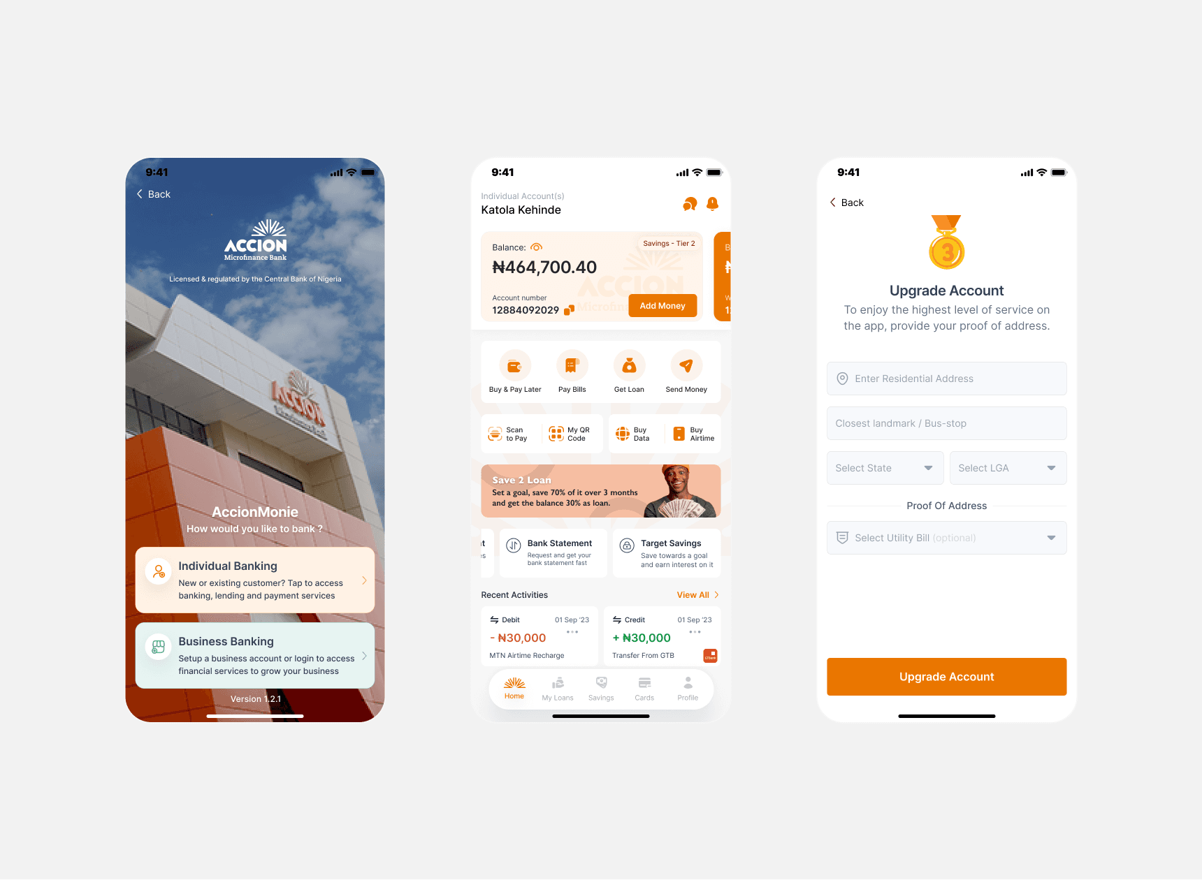 Accion Microfinance Bank wanted to improve how their mobile banking app served everyday Nigerians.The initial AccionMonie mobile app faced challenges with a less secure onboarding process and limited functionality, which led to a poor user experience. The app struggled with low engagement, difficulty in accessing key features like loans and payments, and didn’t inspire much trust. Many customers still preferred visiting a physical branch, even for simple tasks like checking their balance.