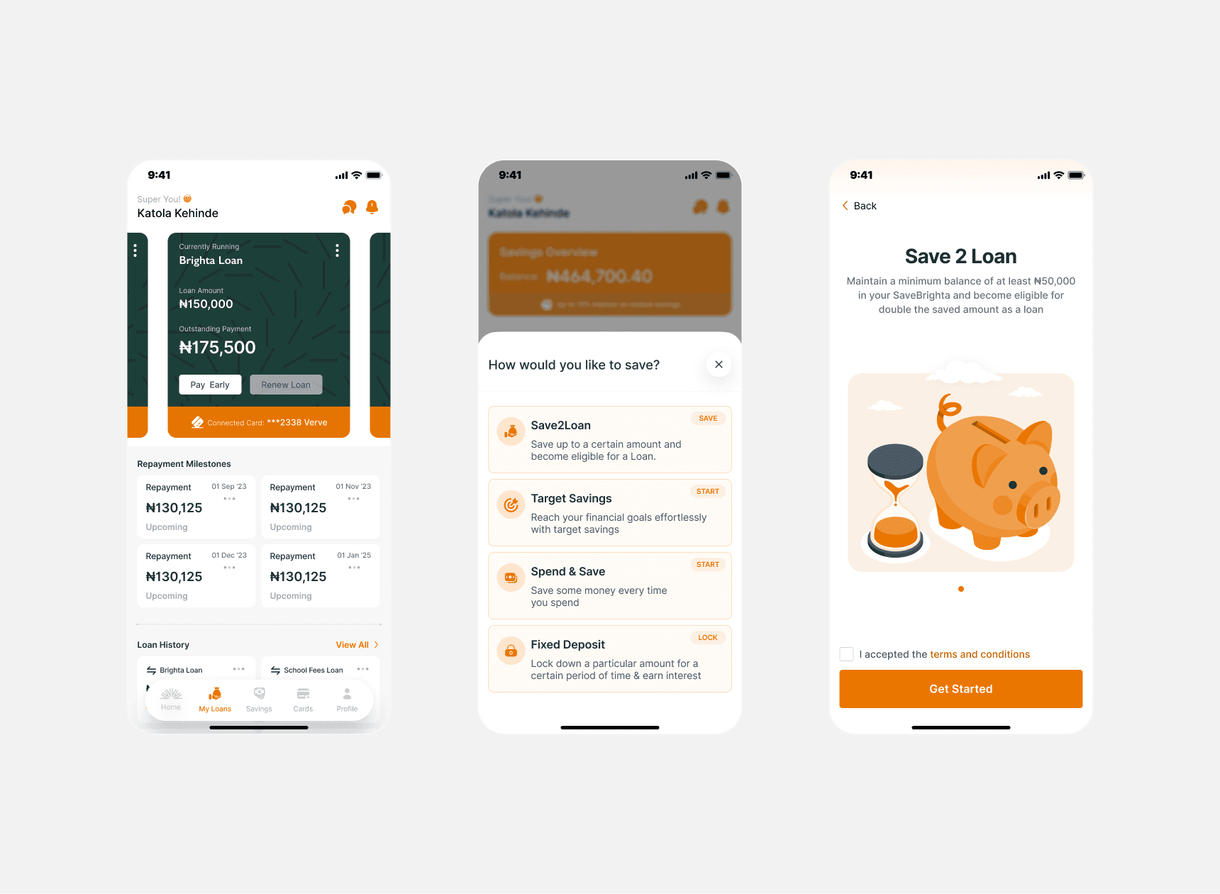 The savings feature on AccionMonie was designed to give users flexible ways to build financial discipline. From Spend and Save, Save2Loan, Target Savings, and Fixed Deposit, each plan was designed to help users save according to their goals and income patterns, making saving feel more personal and achievable.