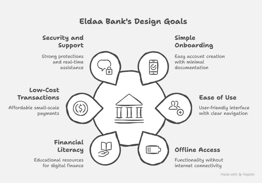 Eldaa Bank was designed to be simple and easy to trust. Users can sign up with just their phone number, and the interface stays clear and friendly for first-time digital users. The app also works offline for basic tasks like checking balances, and it includes financial literacy guides in local languages to help users learn. It supports low-cost micro-transactions, international transfers, and QR payments for businesses. Security features like PINs, biometrics, and encryption help users feel safe while banking on their phones.
