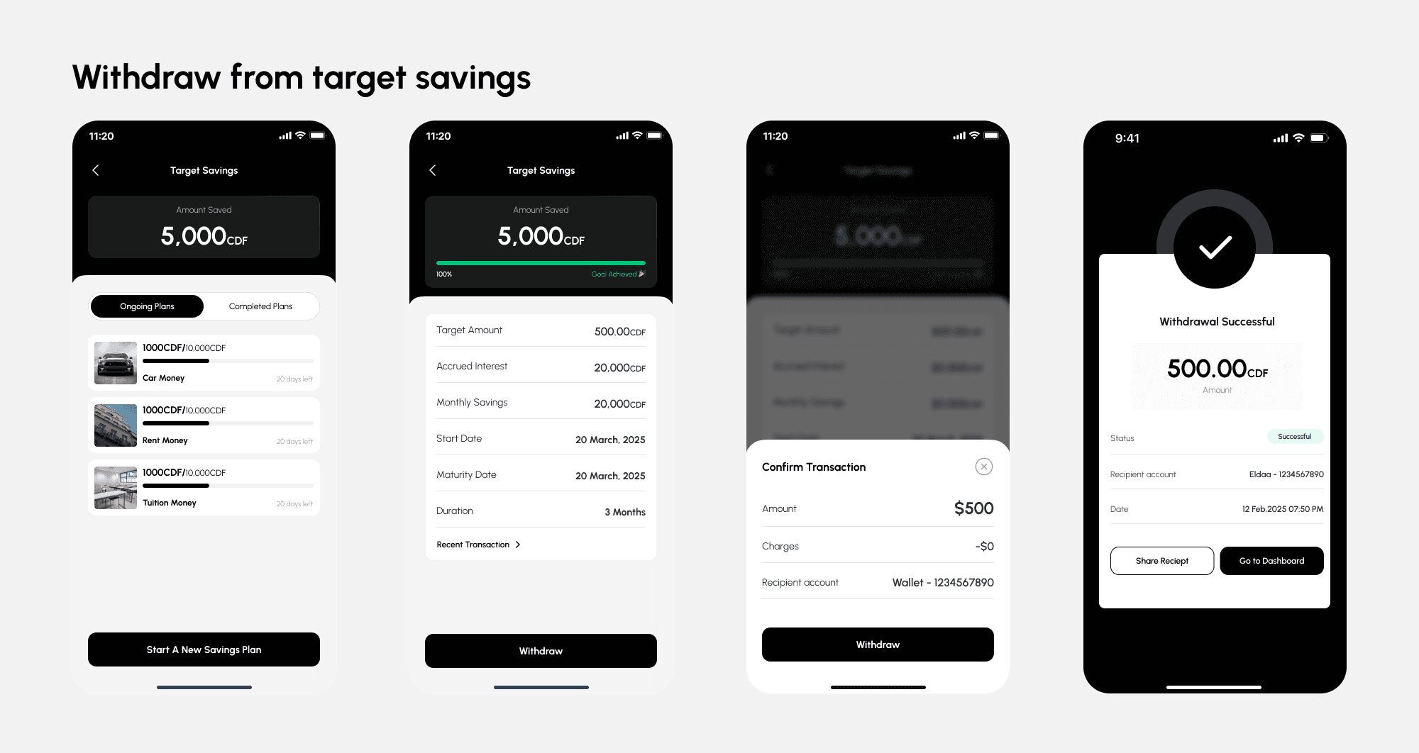 These are goal-based plans that help users stay consistent. Setting one up is easy. Users name their goal, pick a category like rent or tuition, and choose how much they want to save and how often. A built-in calendar lets them select their start and end dates visually, which reduces mistakes. Before activating the plan, they see a quick summary of the amount, frequency, and source wallet. Once everything is confirmed, a clear “Target Created” screen wraps it up and makes the plan feel official.