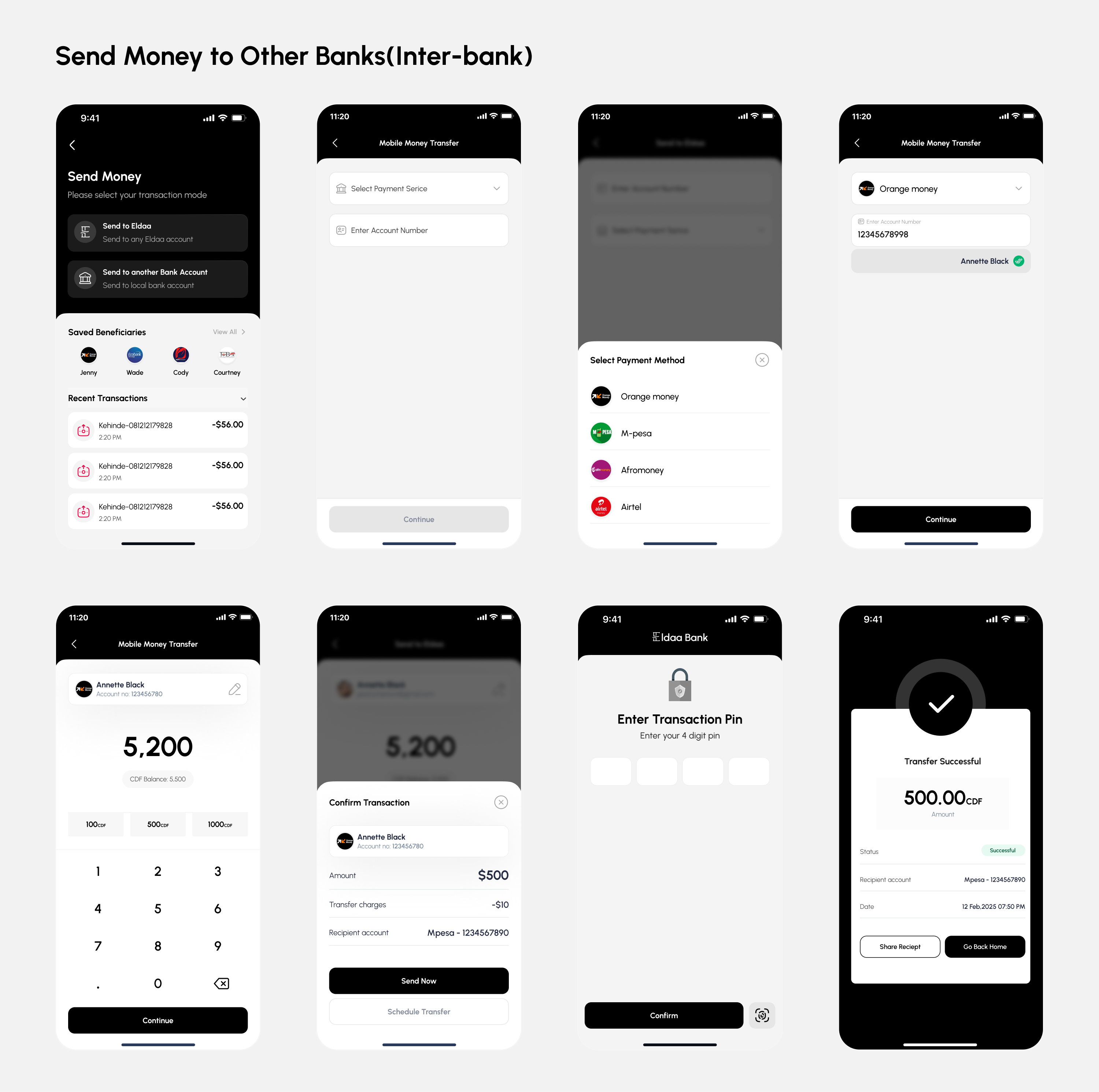 Eldaa Bank is a digital-first banking platform designed to give people in the DRC a simple way to manage their money. The goal was to create an experience that feels straightforward, dependable, and accessible to everyday users. Eldaa brings key financial services into one place so people can send money, pay bills, and handle basic banking needs directly on their phones. The product was built to feel familiar even to first-time digital users, offering a practical step toward modern banking without requiring a visit to a physical branch.