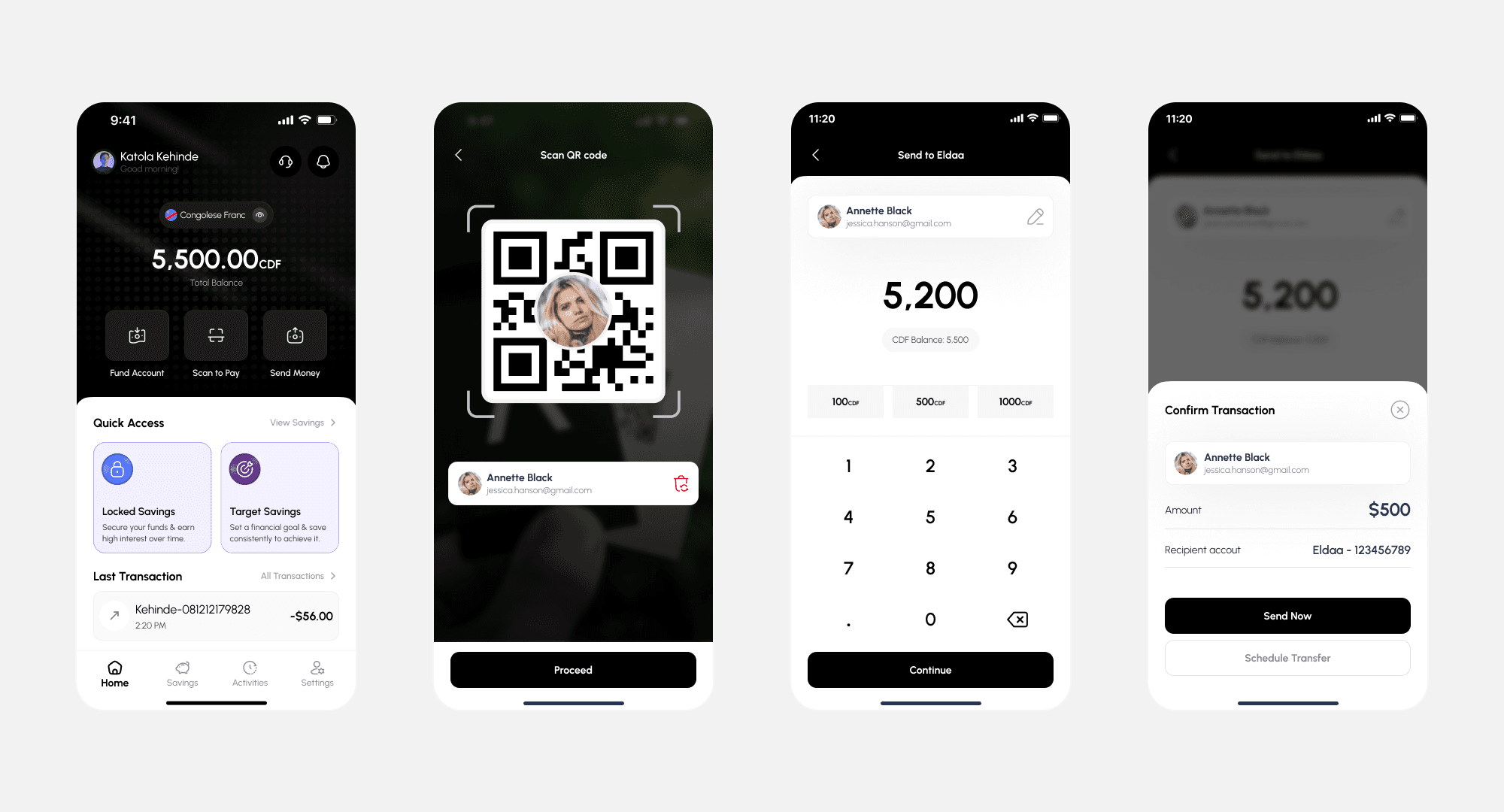 Scan-to-Pay was built for quick daily transactions. Users can open the camera from the home screen and scan any merchant or personal QR code. When the code is valid, the recipient’s details fill in automatically so payment can continue right away. After this, the flow continues just like a normal transfer with amount entry, confirmation, and a final success screen.