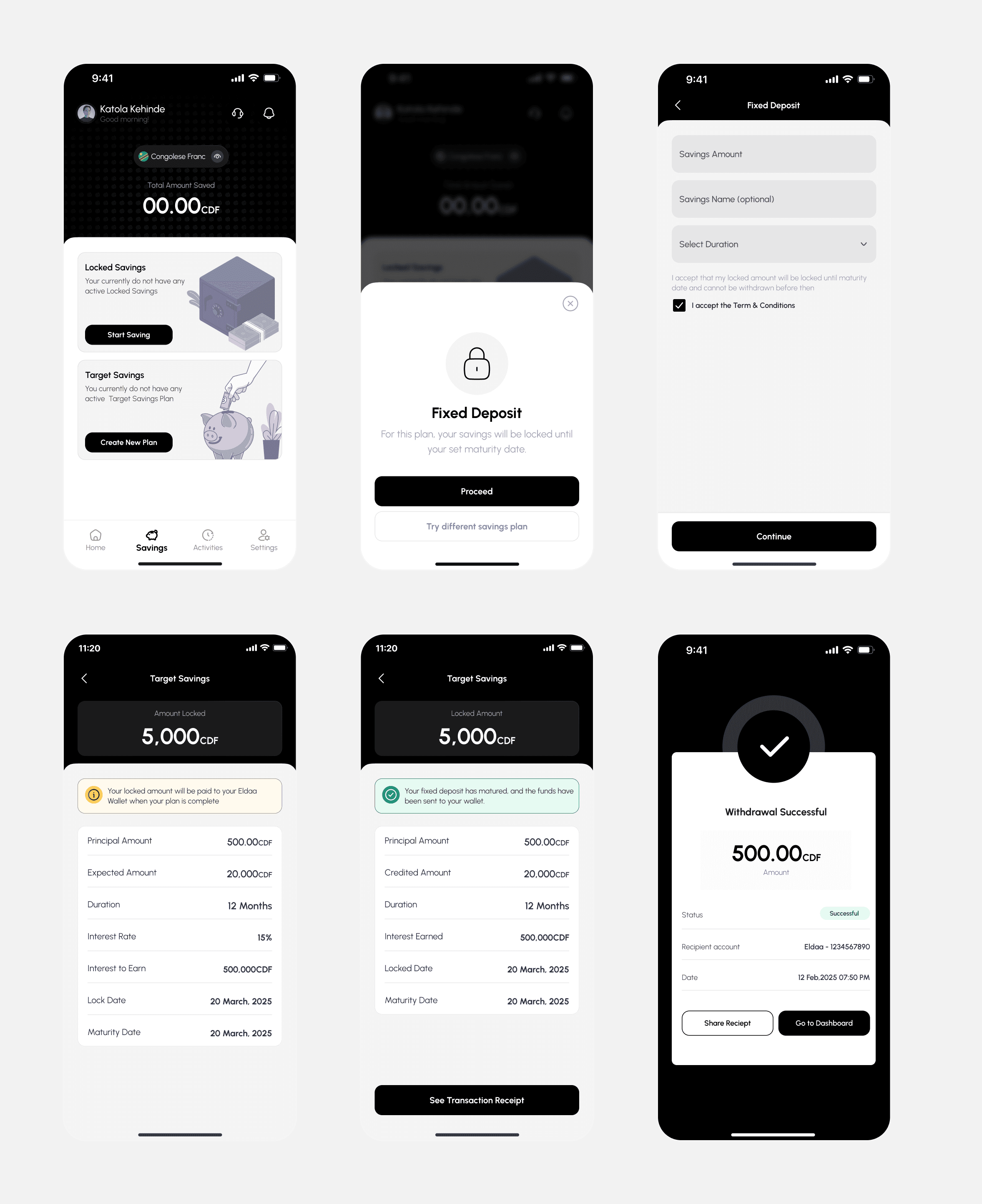 Fixed deposits are for users who want to lock in money and earn more over time. They can choose preset terms like 3, 6, or 12 months, and a preview card shows the amount, interest rate, and what they’ll get at maturity. After confirming, the flow ends with the same clear success screen used across the app, which keeps the experience familiar and reassuring.
