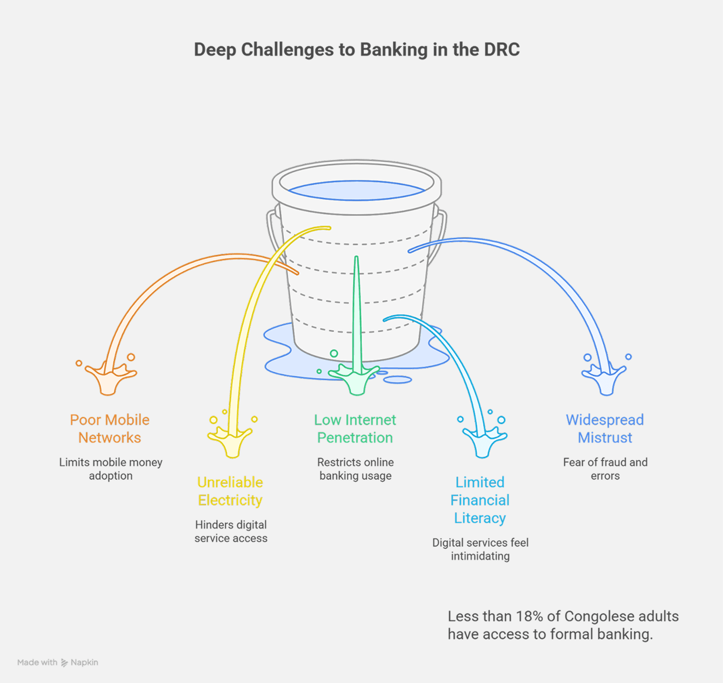 Less than 18 percent of adults in the DRC have access to formal banking. Most people still rely on cash for daily transactions, and mobile money hasn’t grown the way it has in other African countries. The challenges come from both structural and social barriers. Mobile networks are unstable, electricity is unreliable, and internet access is still limited. Many people also have low financial literacy, which makes digital banking feel confusing or risky. Even when apps are available, mistrust is a major issue. People worry about losing money or making mistakes they can’t fix.
