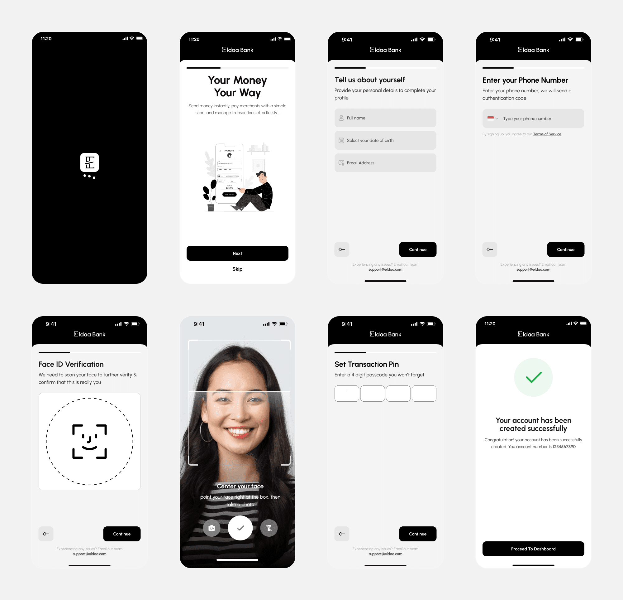 Eldaa’s onboarding was designed to feel friendly and easy to follow, especially for people using digital banking for the first time. Each step is guided, with clear visuals, simple inputs, and progress indicators that show where the user is in the process. Verification was also structured to feel less intimidating. Phone number entry, SMS codes, personal details, and face verification happen one step at a time so nothing feels confusing or rushed.