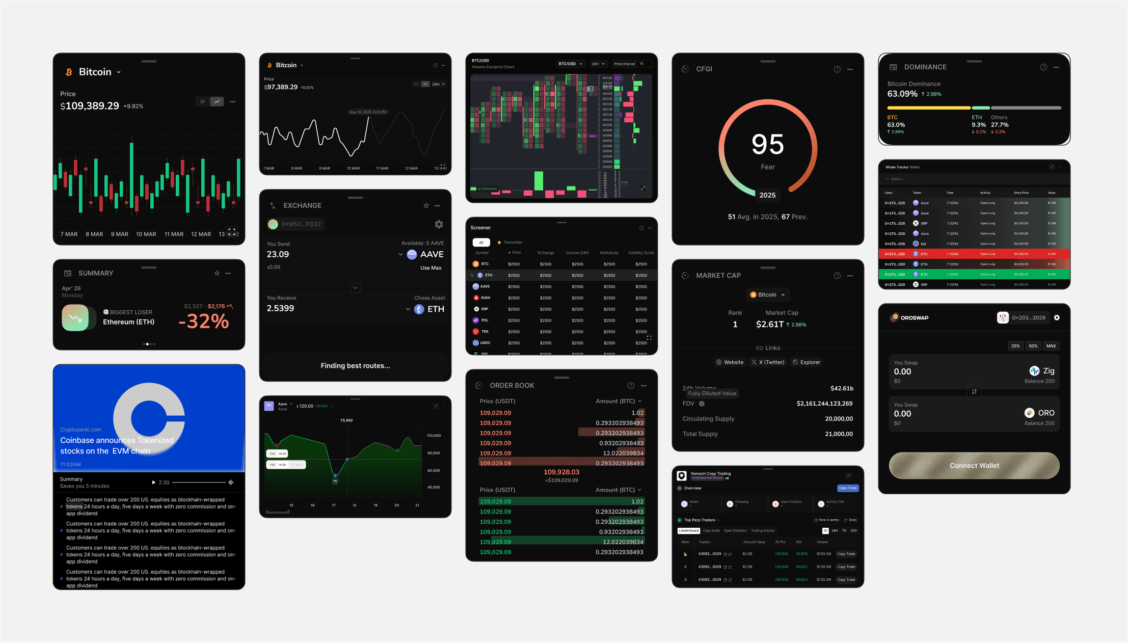 Widgets are designed with an expandable state, allowing traders to zoom in when they need deeper detail. With one tap, charts become full trading terminals, news cards open into full feeds, and order books expand into multi-exchange depth views: giving traders full clarity without breaking their flow.