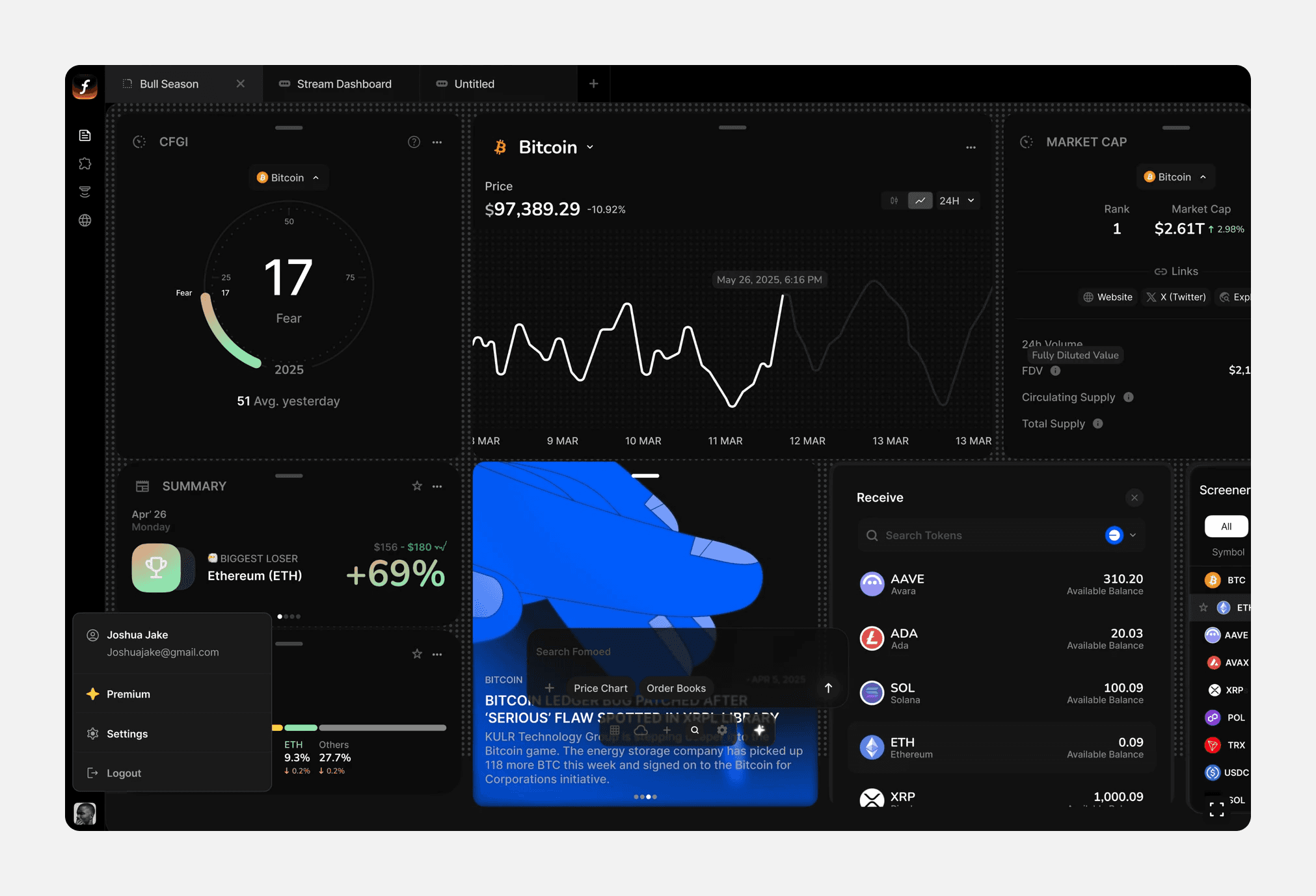 We built sentiment-driven widgets that helped traders read the market’s mood at a glance. ⚫︎ Fear & Greed Index: Redesigned as a gauge visualization with historical context. Backed by user interviews → traders valued a quick-glance “market mood.” ⚫︎ News Feed Widget: Curated market news. Expandable into a full news feed with filters (e.g., DeFi, NFTs).