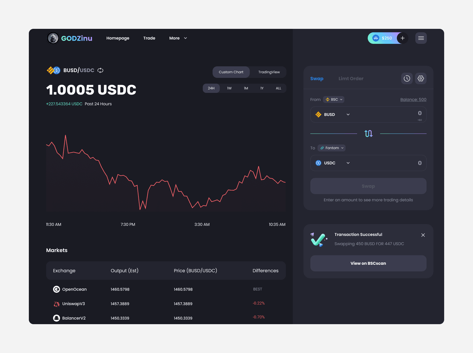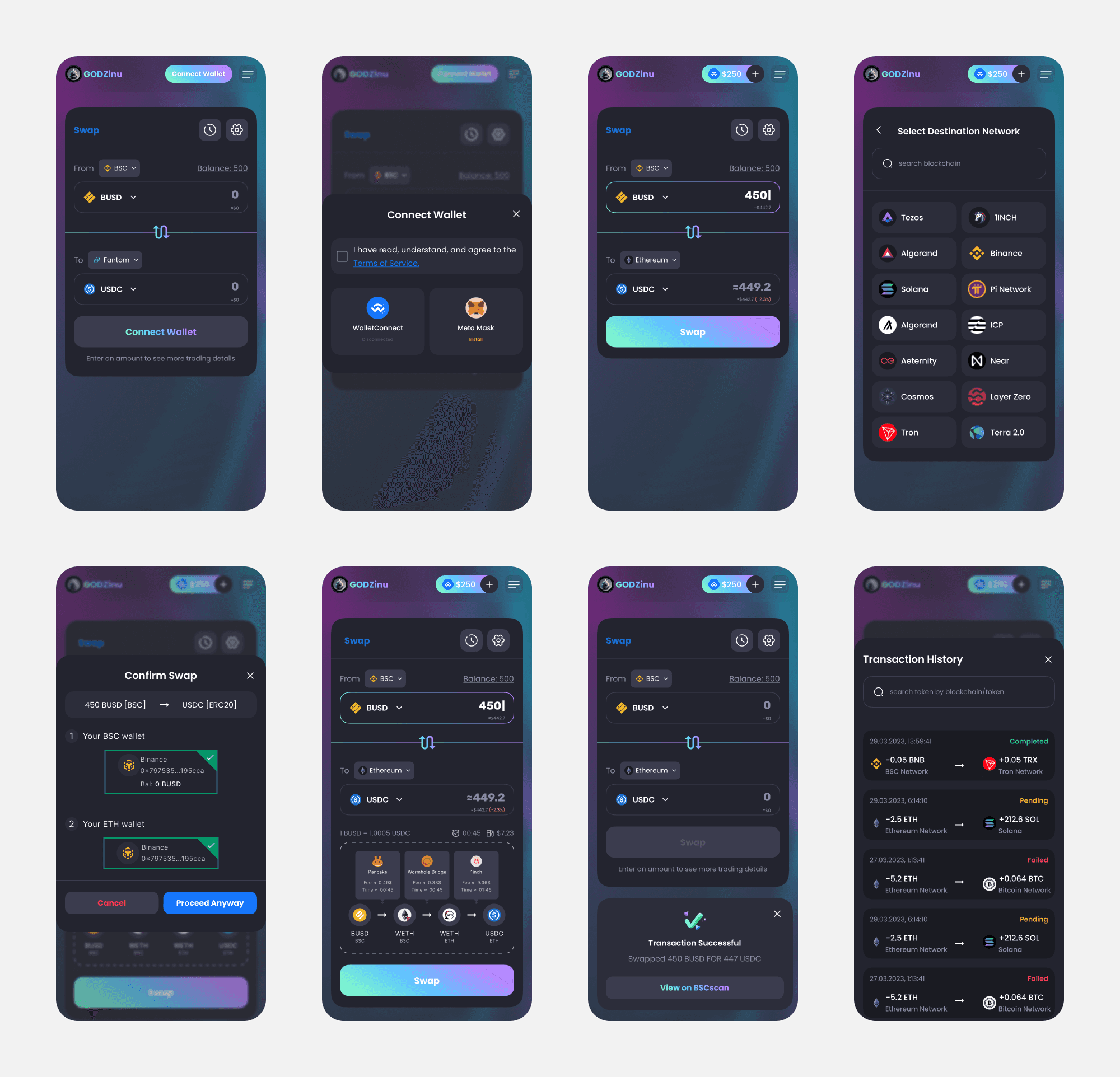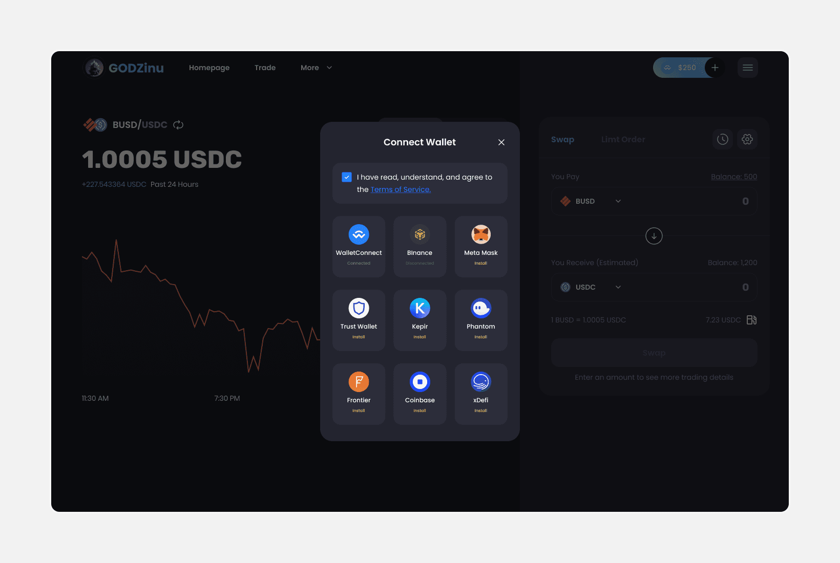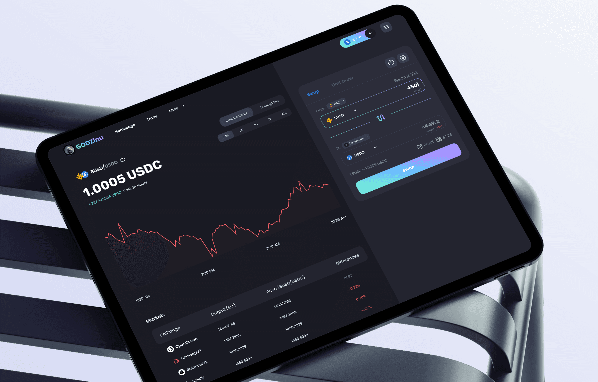 I designed a clean, accessible token-swapping experience that makes the core value of Godzinnu. Optimal swaps feel effortless. The UI surfaces real-time comparisons under the hood but presents users with a single, confident action: “Swap Now.” I designed responsive interfaces for mobile and desktop, added wallet connection flows, and built clear transaction feedback states to reduce anxiety. Visual cues help users see where their liquidity is coming from, and educational touches guide first-time swappers without overwhelming them.