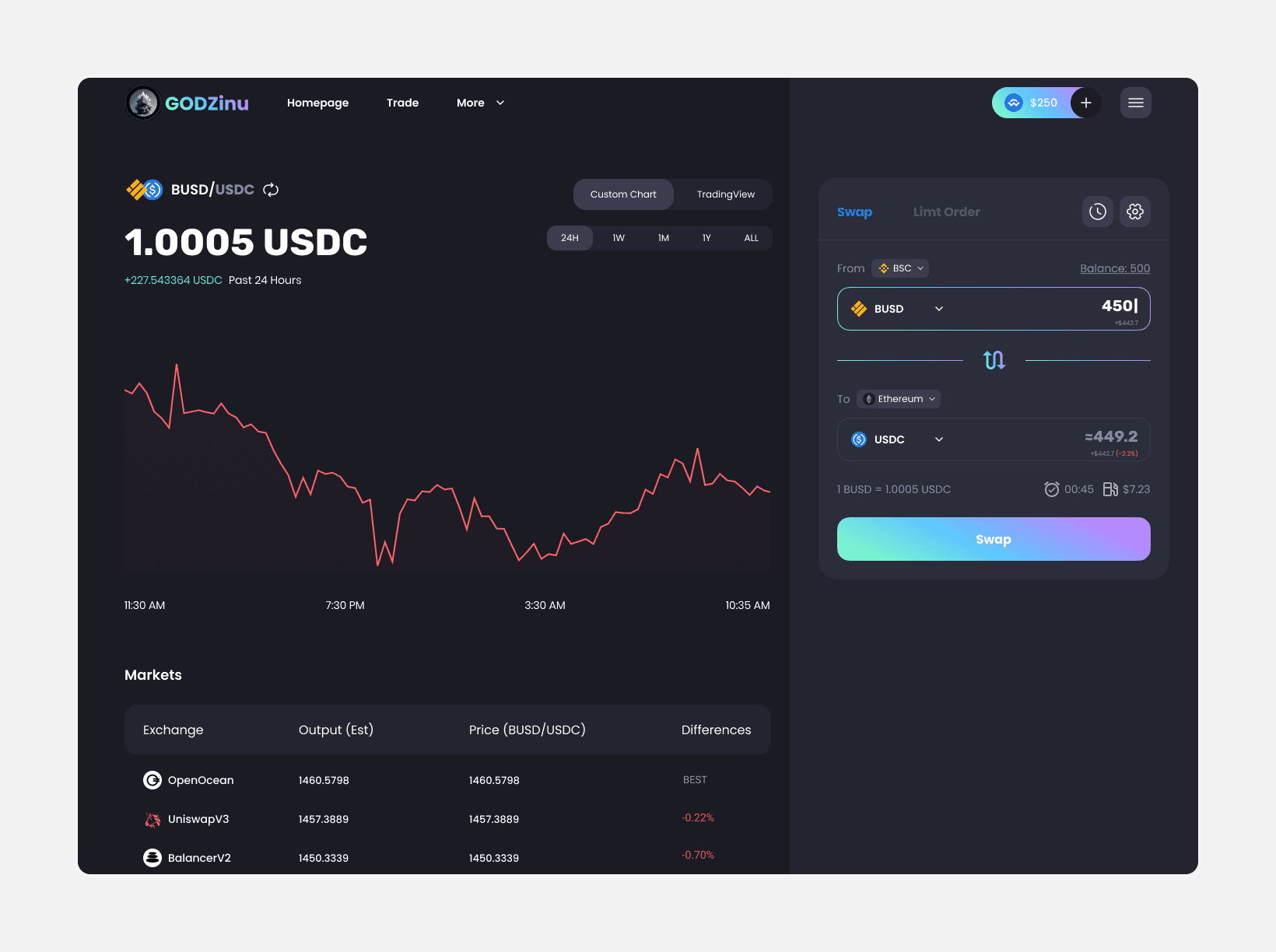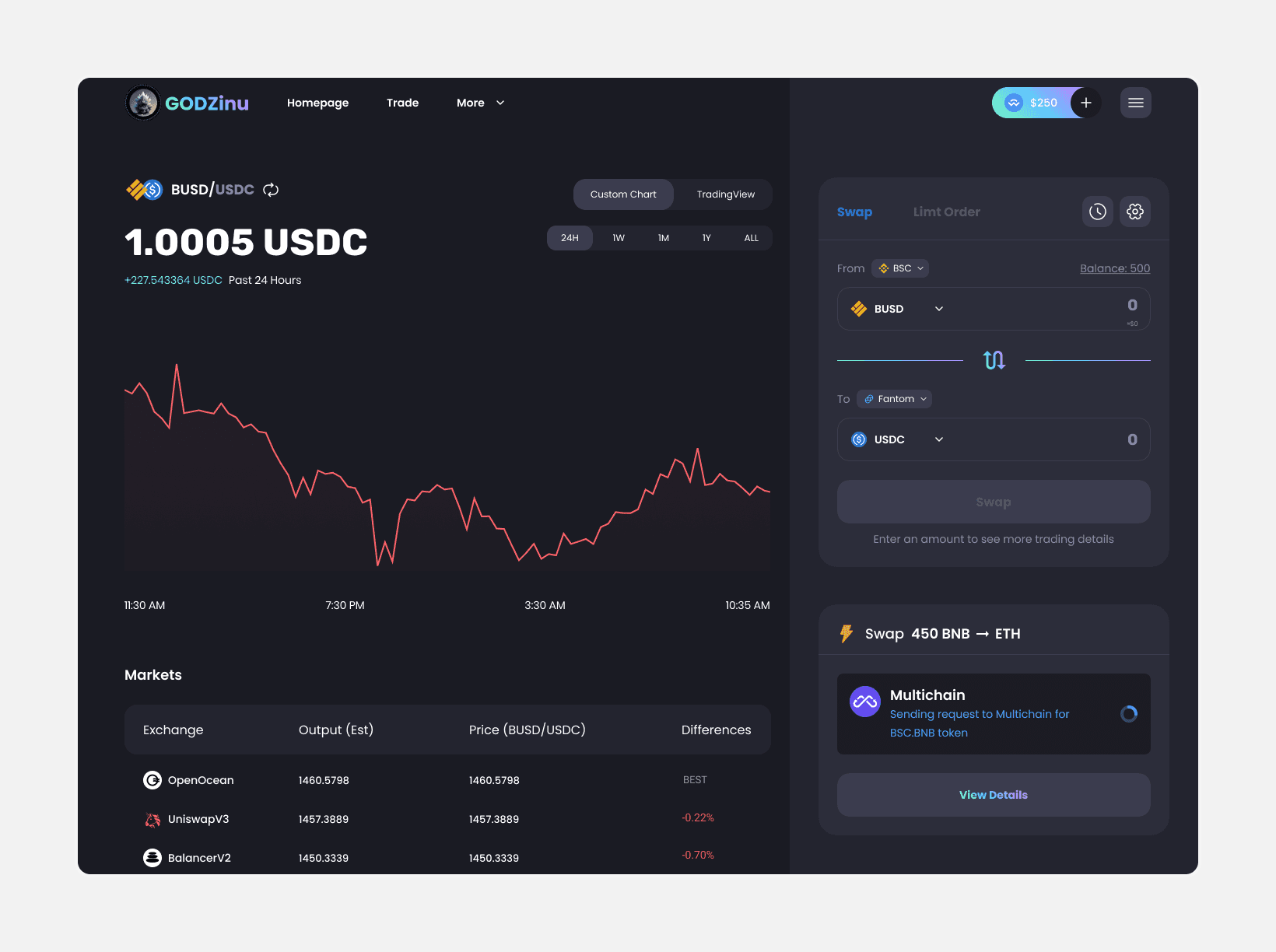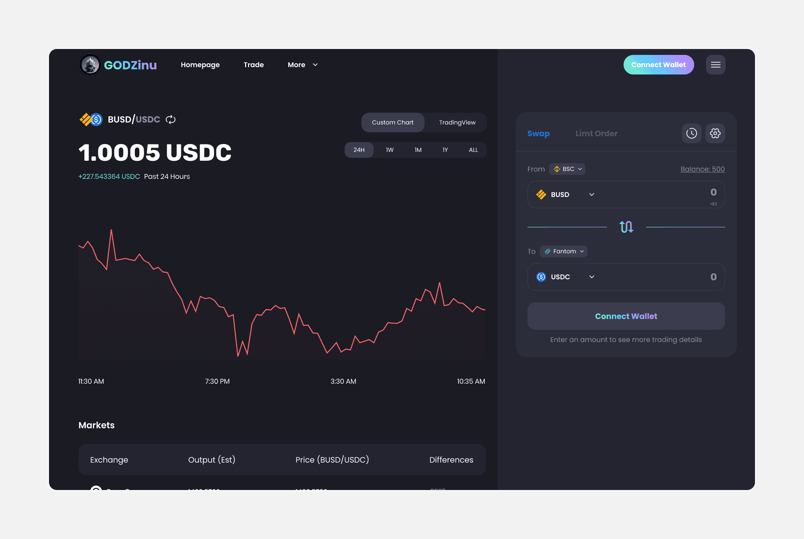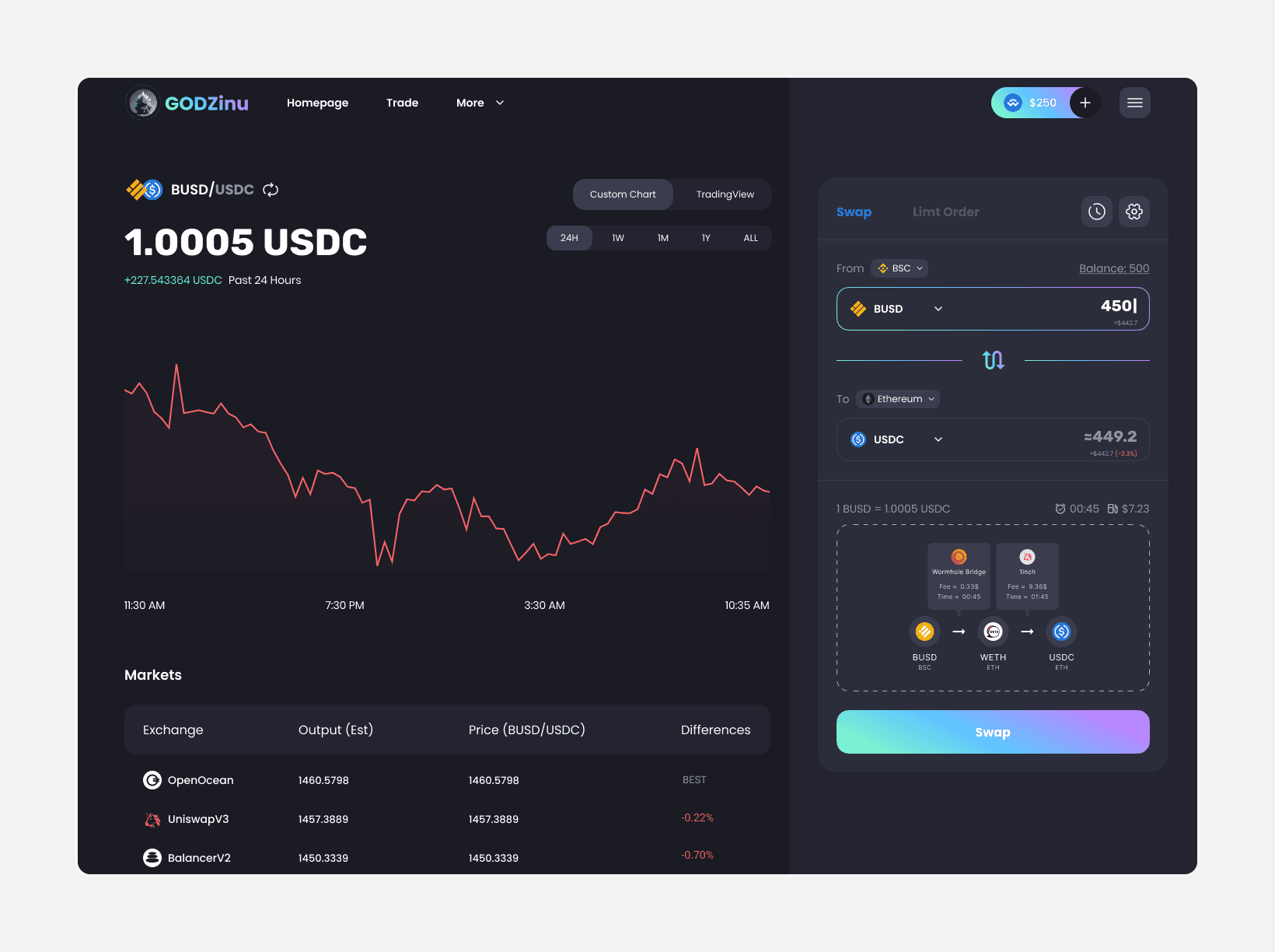 I designed a clean, accessible token-swapping experience that makes the core value of Godzinnu. Optimal swaps feel effortless. The UI surfaces real-time comparisons under the hood but presents users with a single, confident action: “Swap Now.” I designed responsive interfaces for mobile and desktop, added wallet connection flows, and built clear transaction feedback states to reduce anxiety. Visual cues help users see where their liquidity is coming from, and educational touches guide first-time swappers without overwhelming them.