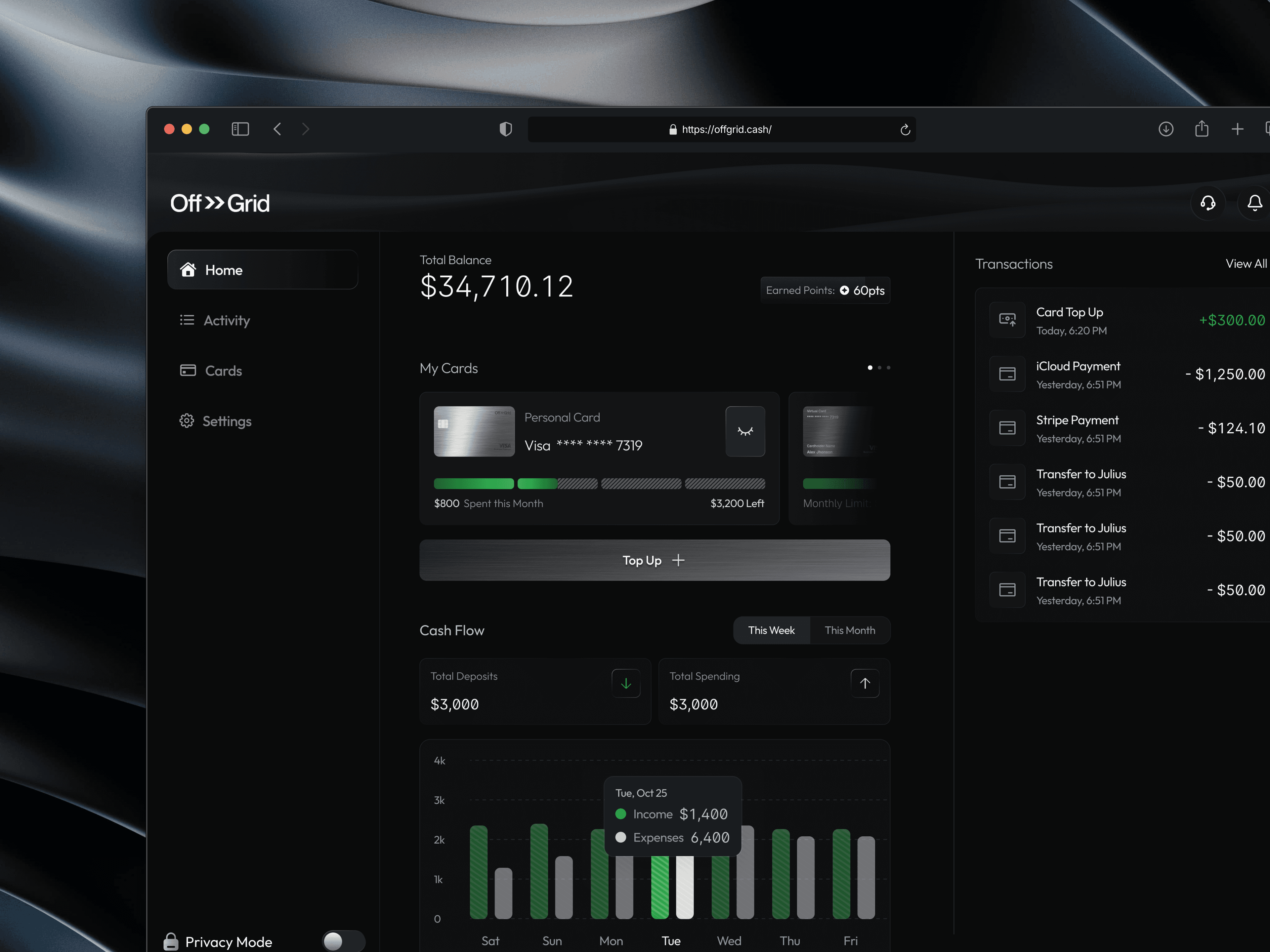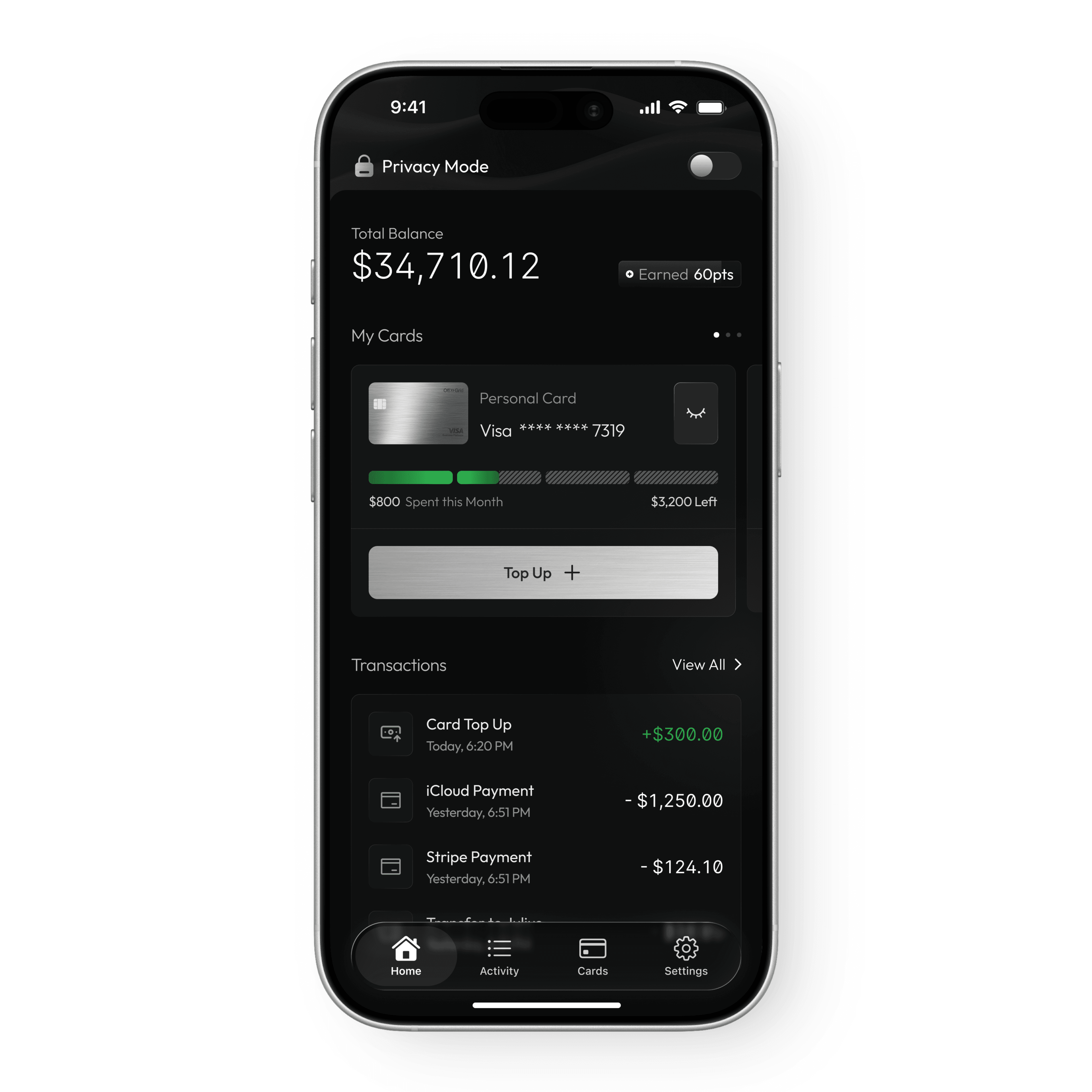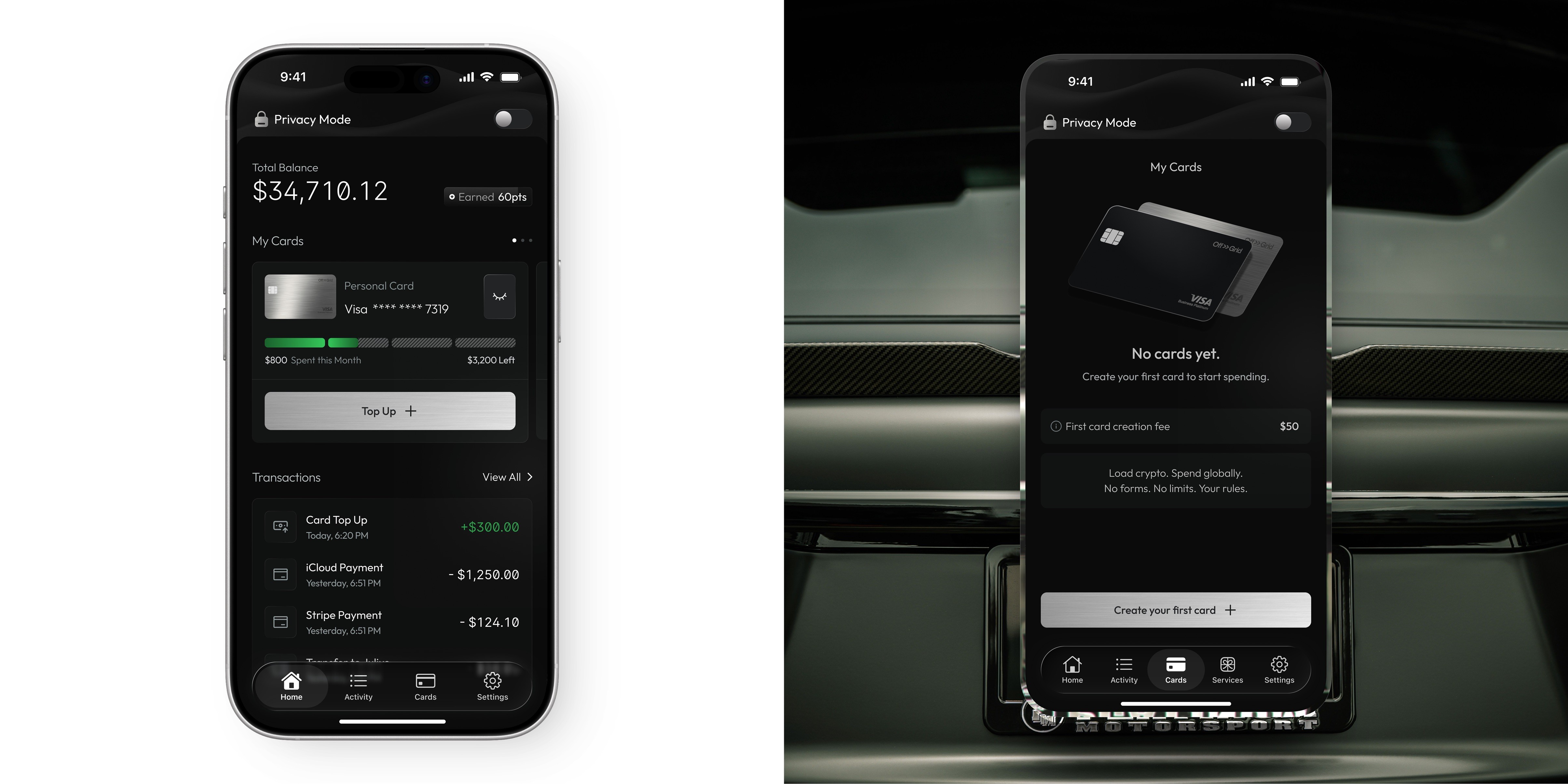 Another key decision was structuring the product around cards instead of accounts. In traditional banking apps, accounts are the foundation and cards are secondary. OffGrid flips this by making cards the primary interaction layer. This approach made the experience feel more tangible and intuitive. Users interact directly with their cards, manage spending through them, and perform actions like top-ups or freezing directly within that context. It simplifies mental models and reduces abstraction, making the product easier to understand.