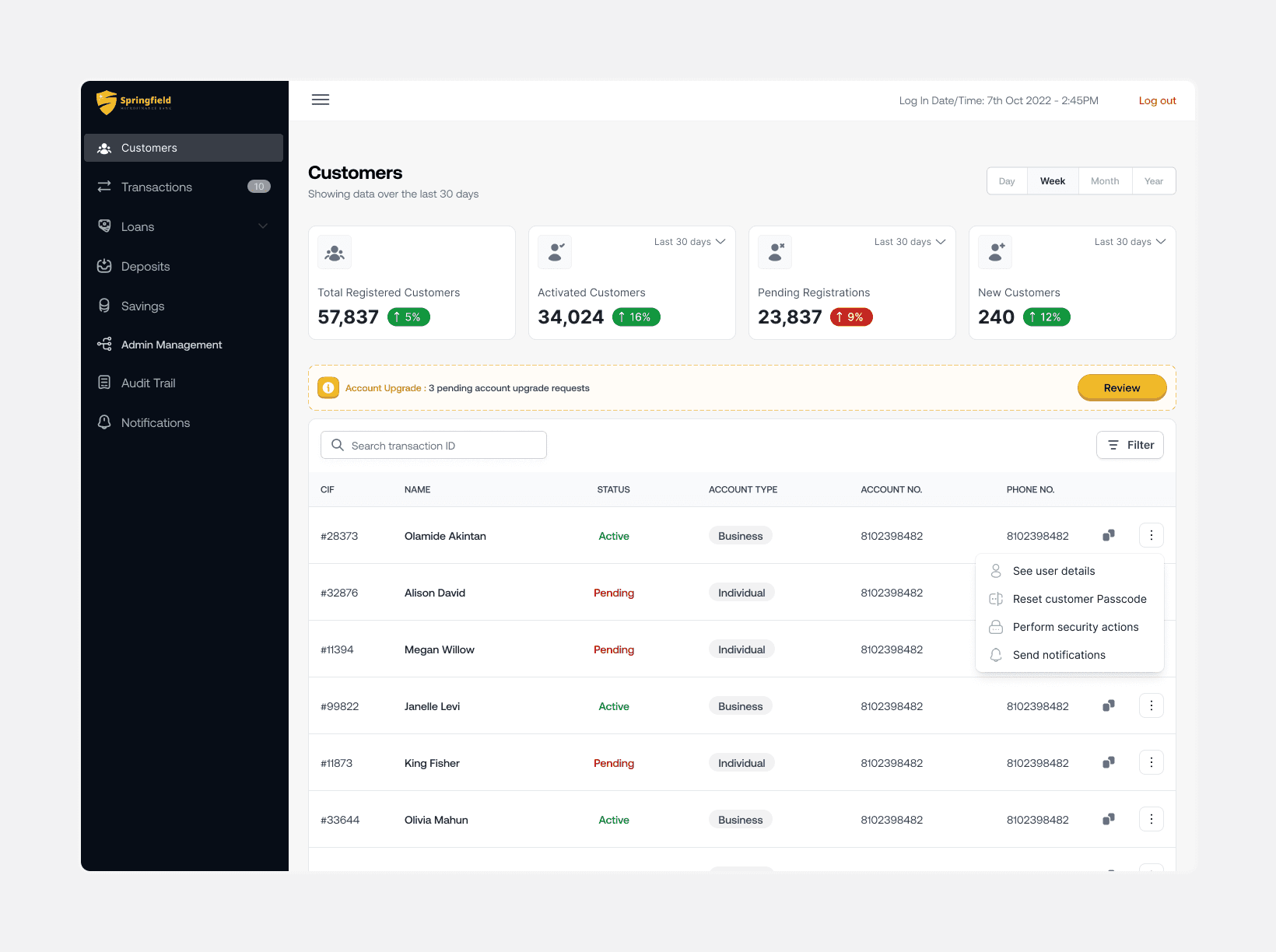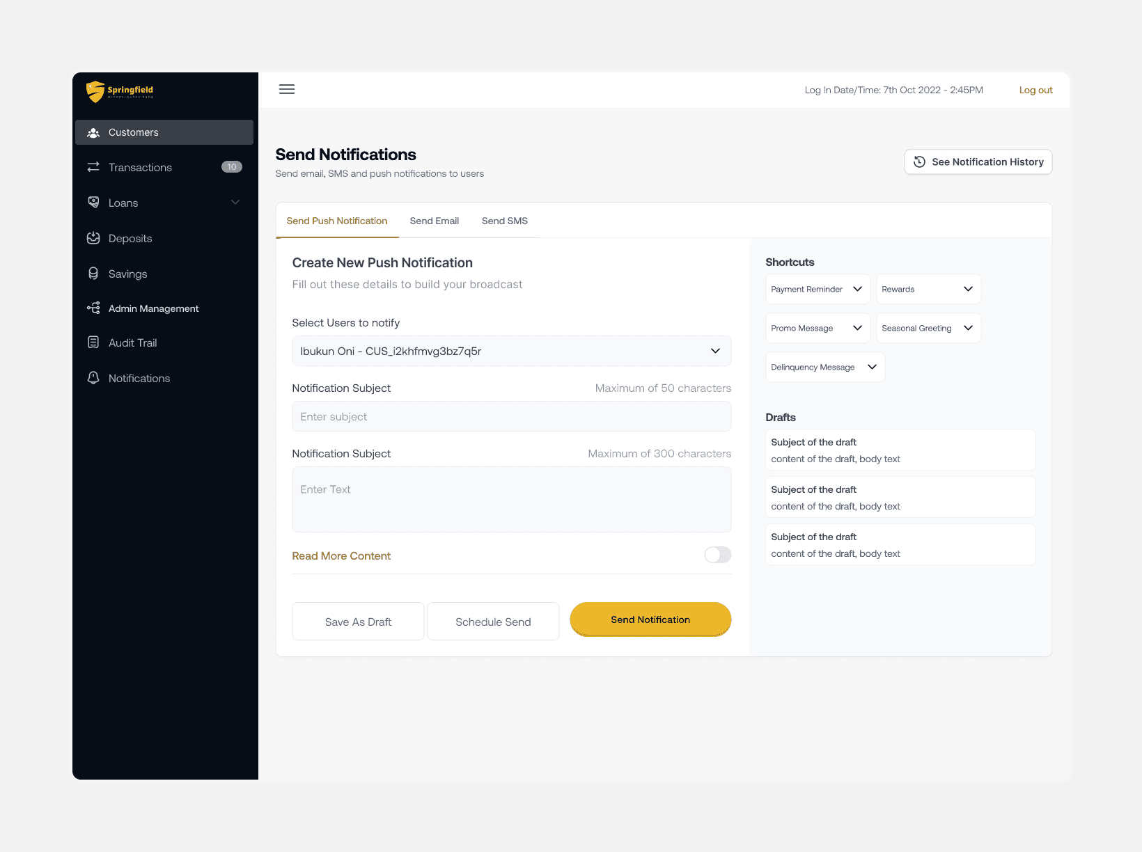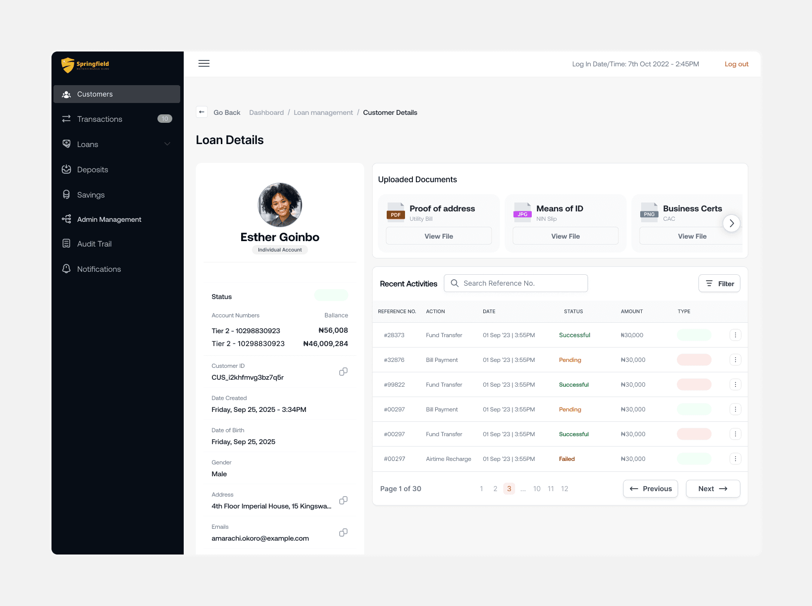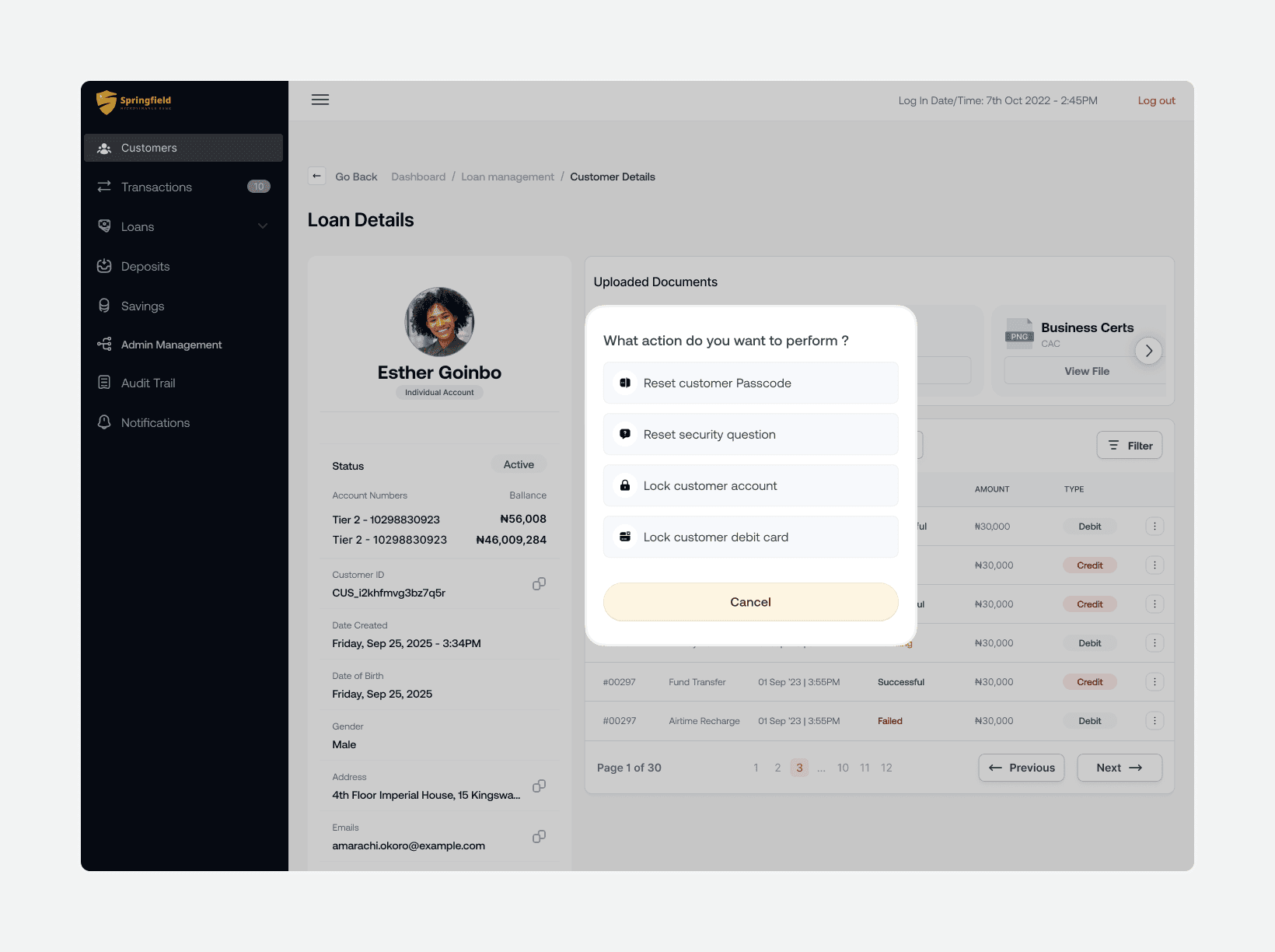 The customer management dashboard gives Springfield’s team a single view of each customer’s details, balances, and activity. Admins can update accounts, manage loans, and send notifications directly from the profile. This flow ensures responses are faster and the team depends less on IT.