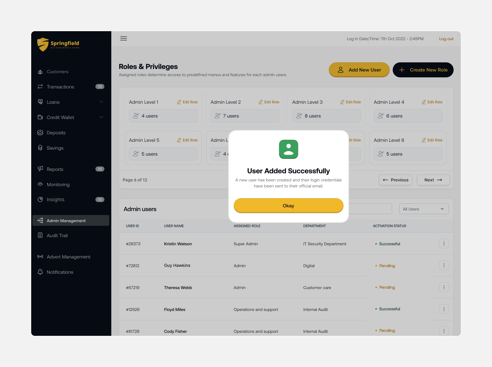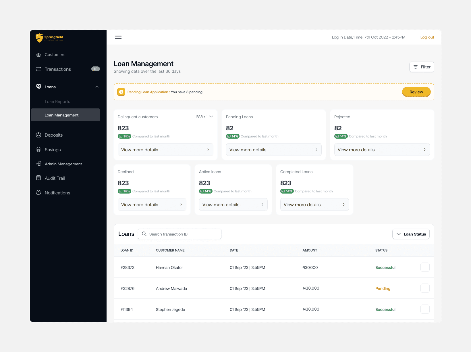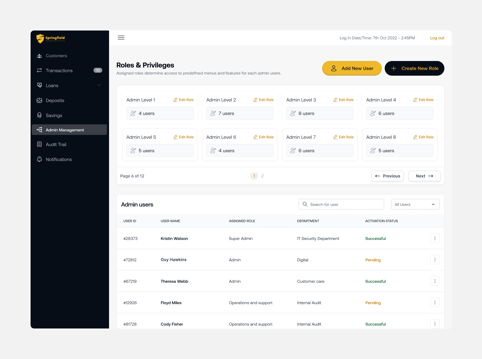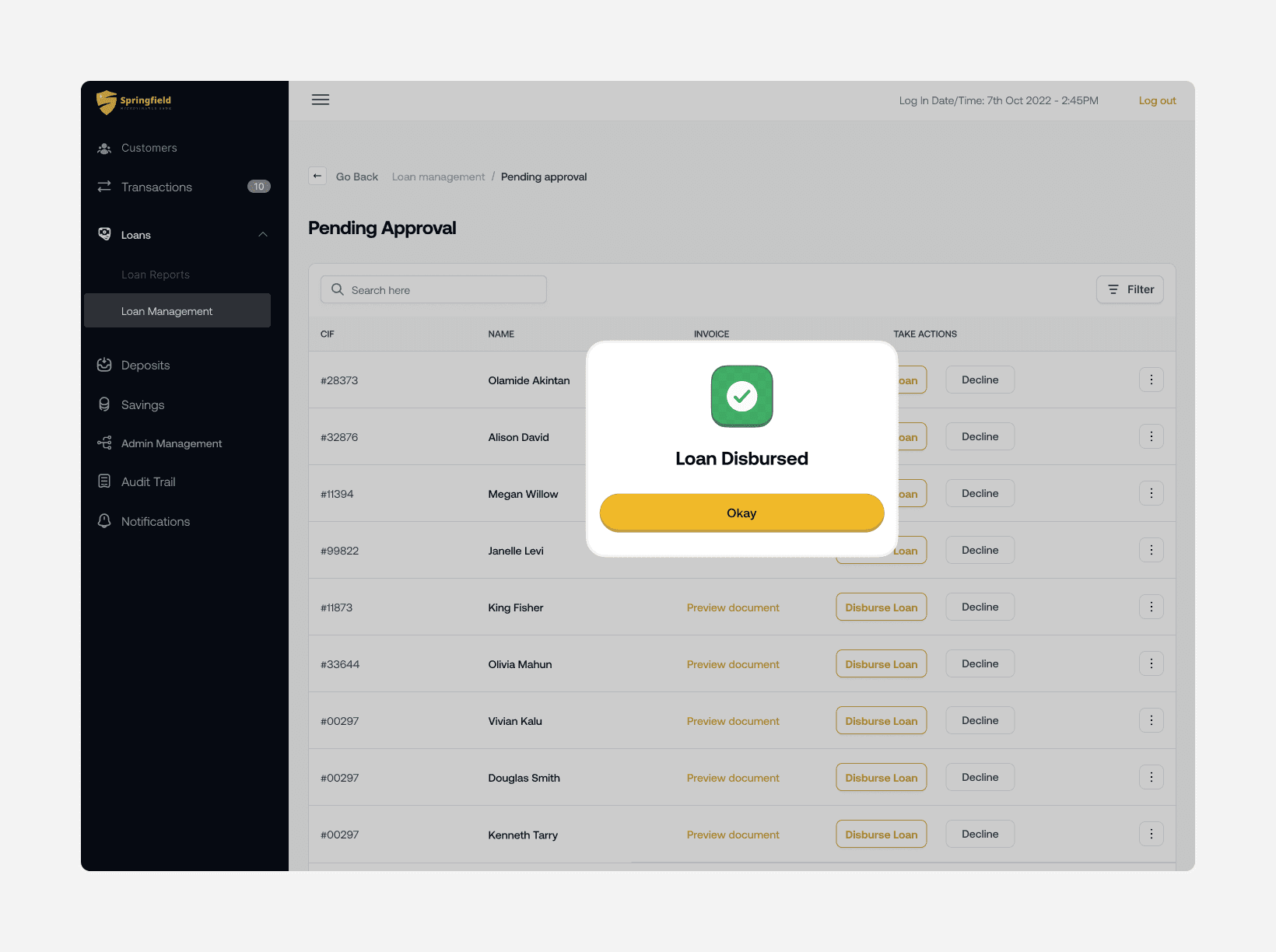 The customer management dashboard gives Springfield’s team a single view of each customer’s details, balances, and activity. Admins can update accounts, manage loans, and send notifications directly from the profile. This flow ensures responses are faster and the team depends less on IT.