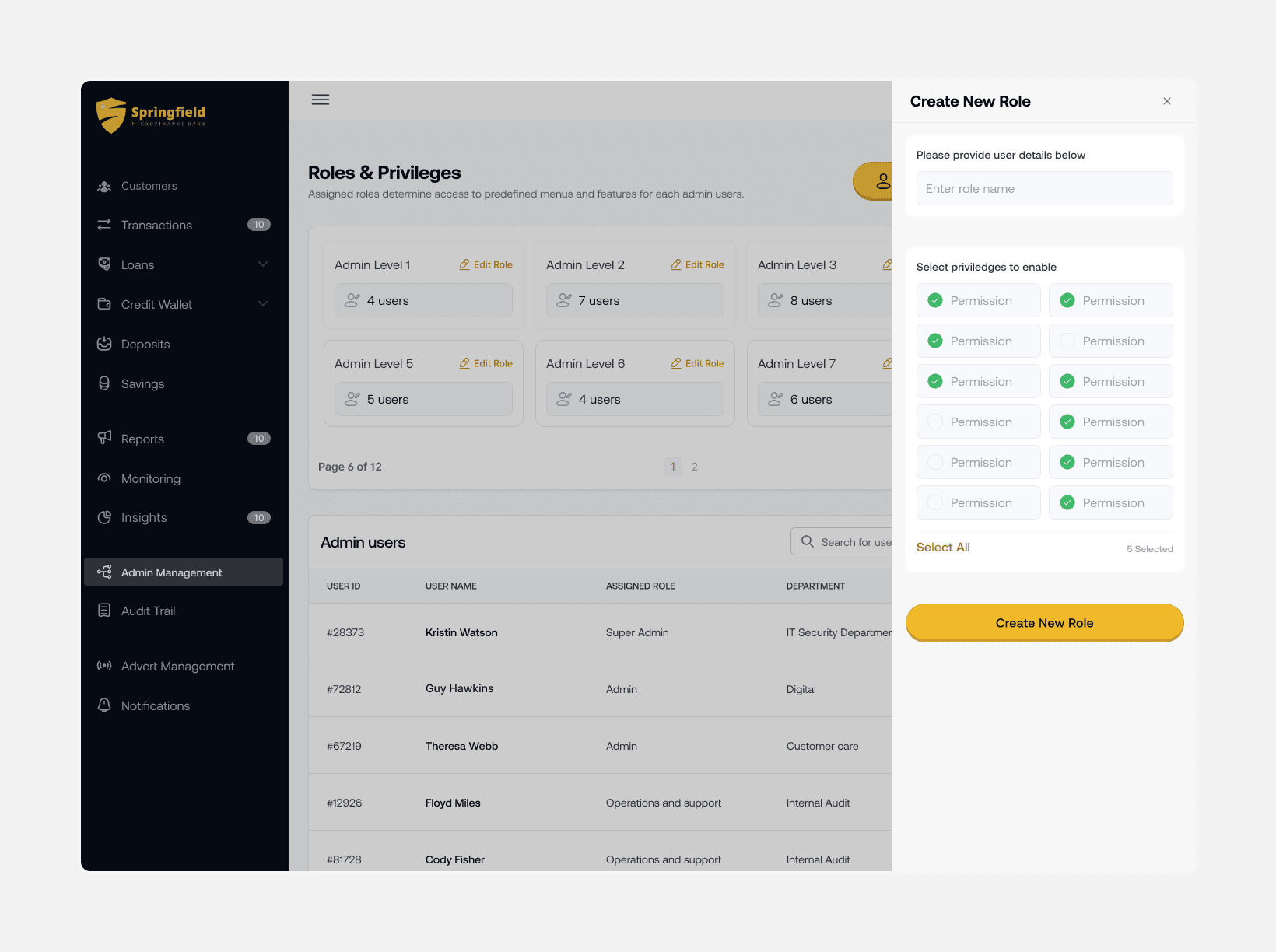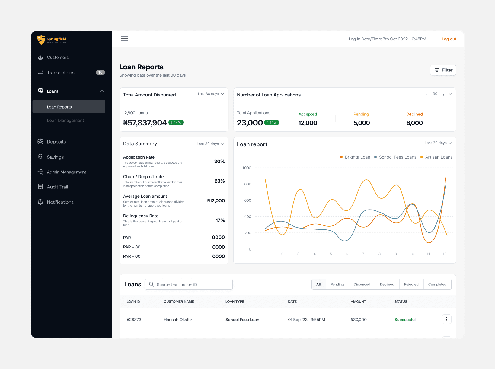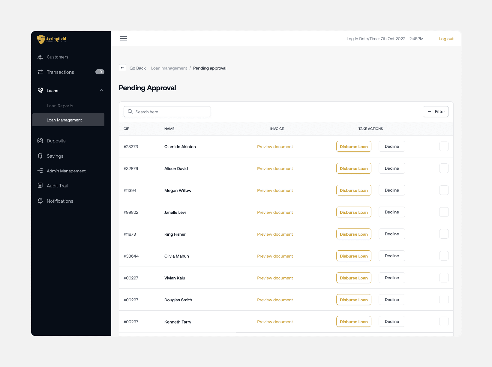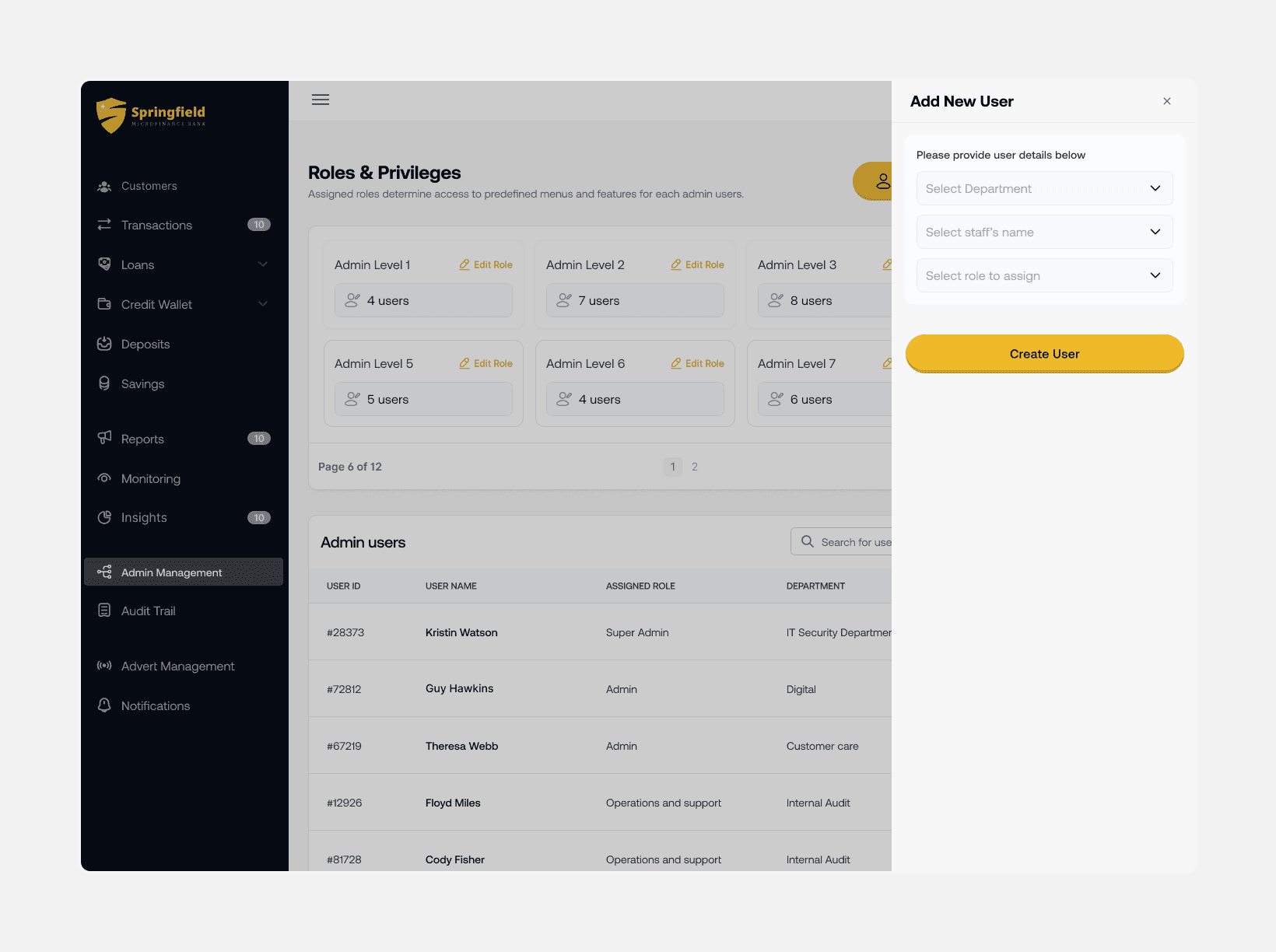 The customer management dashboard gives Springfield’s team a single view of each customer’s details, balances, and activity. Admins can update accounts, manage loans, and send notifications directly from the profile. This flow ensures responses are faster and the team depends less on IT.