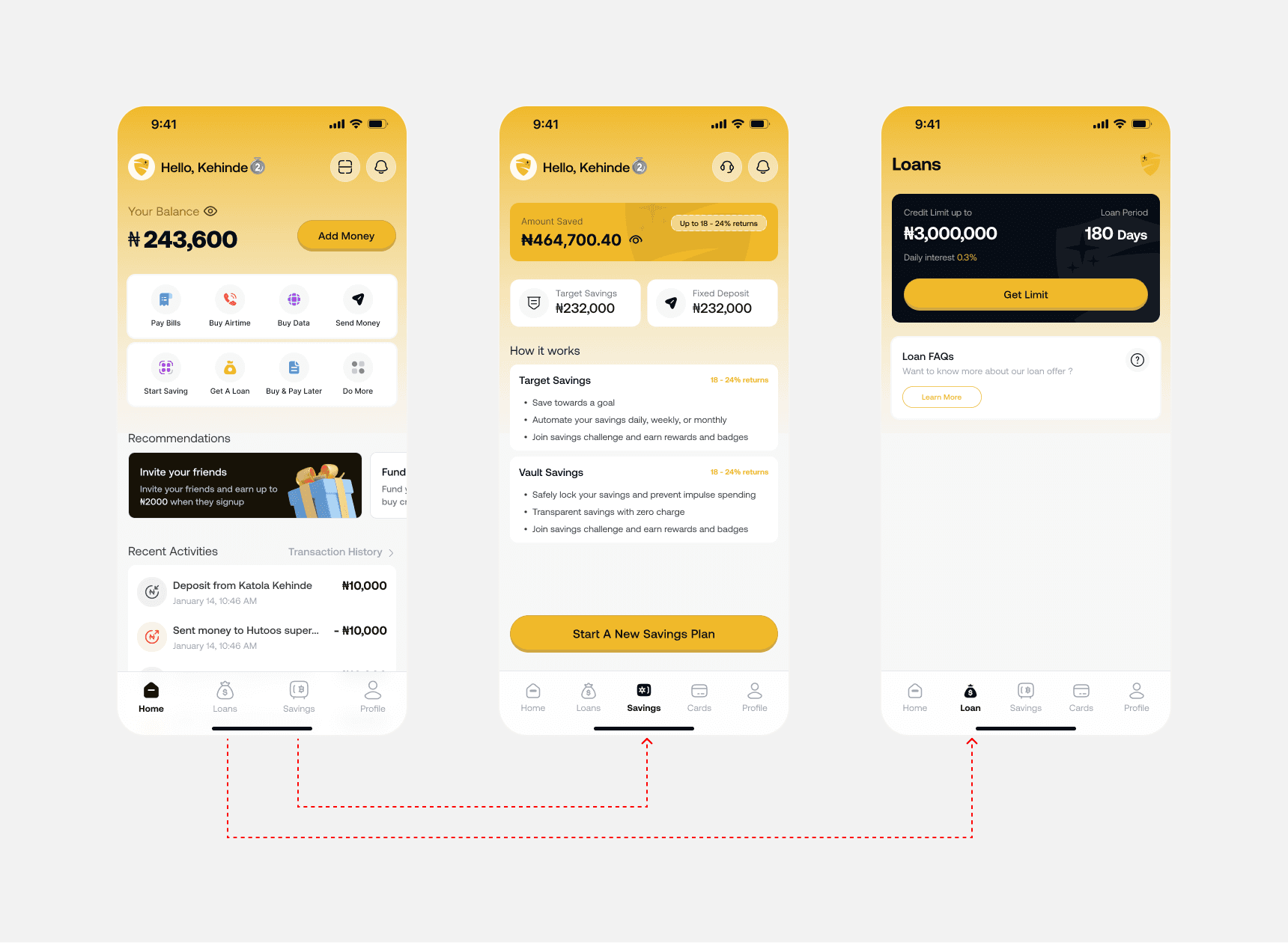 Onboarding our users had to feel easy and familiar, especially because many users would be trying digital banking for the first time. The flow guides them step by step, starting with their phone number, then BVN and NIN so they don’t have to enter too many details manually. After that, they complete a quick face verification to confirm their identity. Each stage is simple, clear, and designed to reduce stress and build trust before they land on the home dashboard.