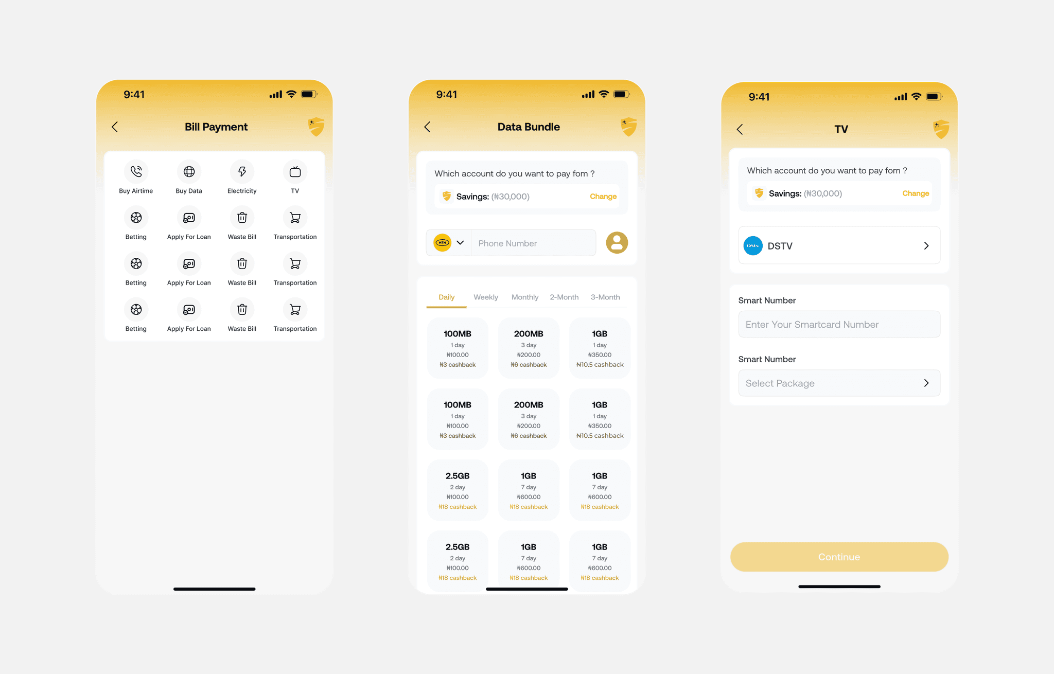 Users can handle airtime, data, cable TV, electricity, betting, and more directly in the app. The flow is designed to stay clear and quick, with real-time feedback and simple confirmation screens.